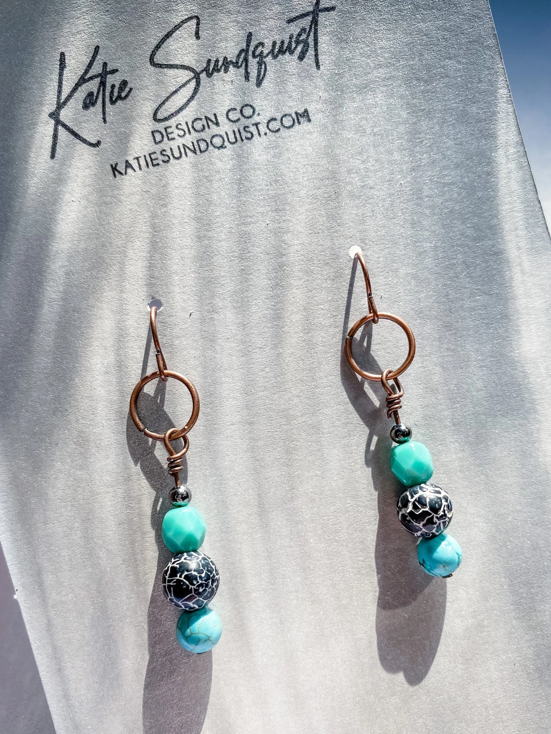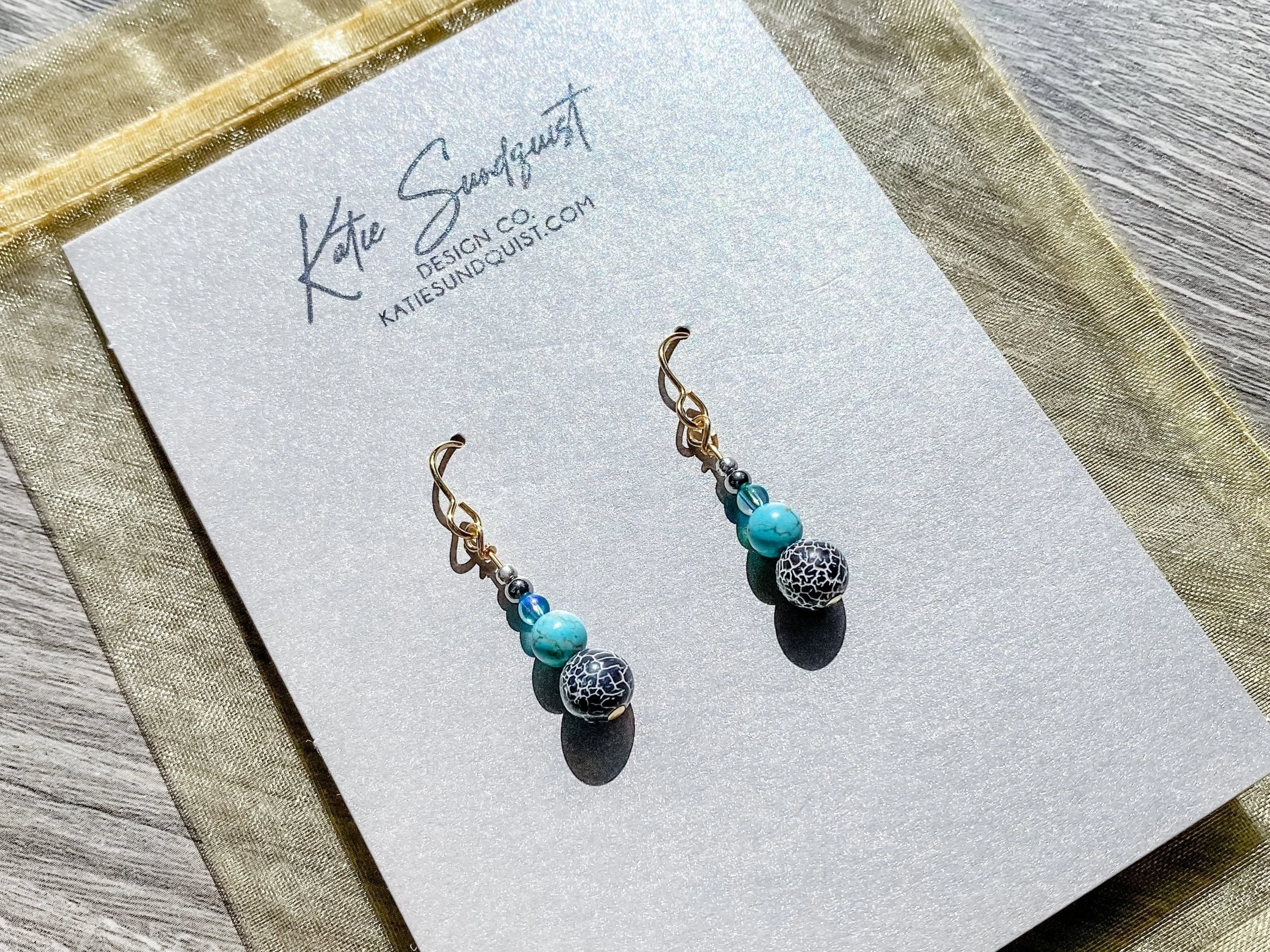 Warm Beach Clay Earrings — Hand-mixed aqua and silver clay with foil leaf and teal glitter on silver earring posts. Sold by the pair, but also available for bulk purchase.
