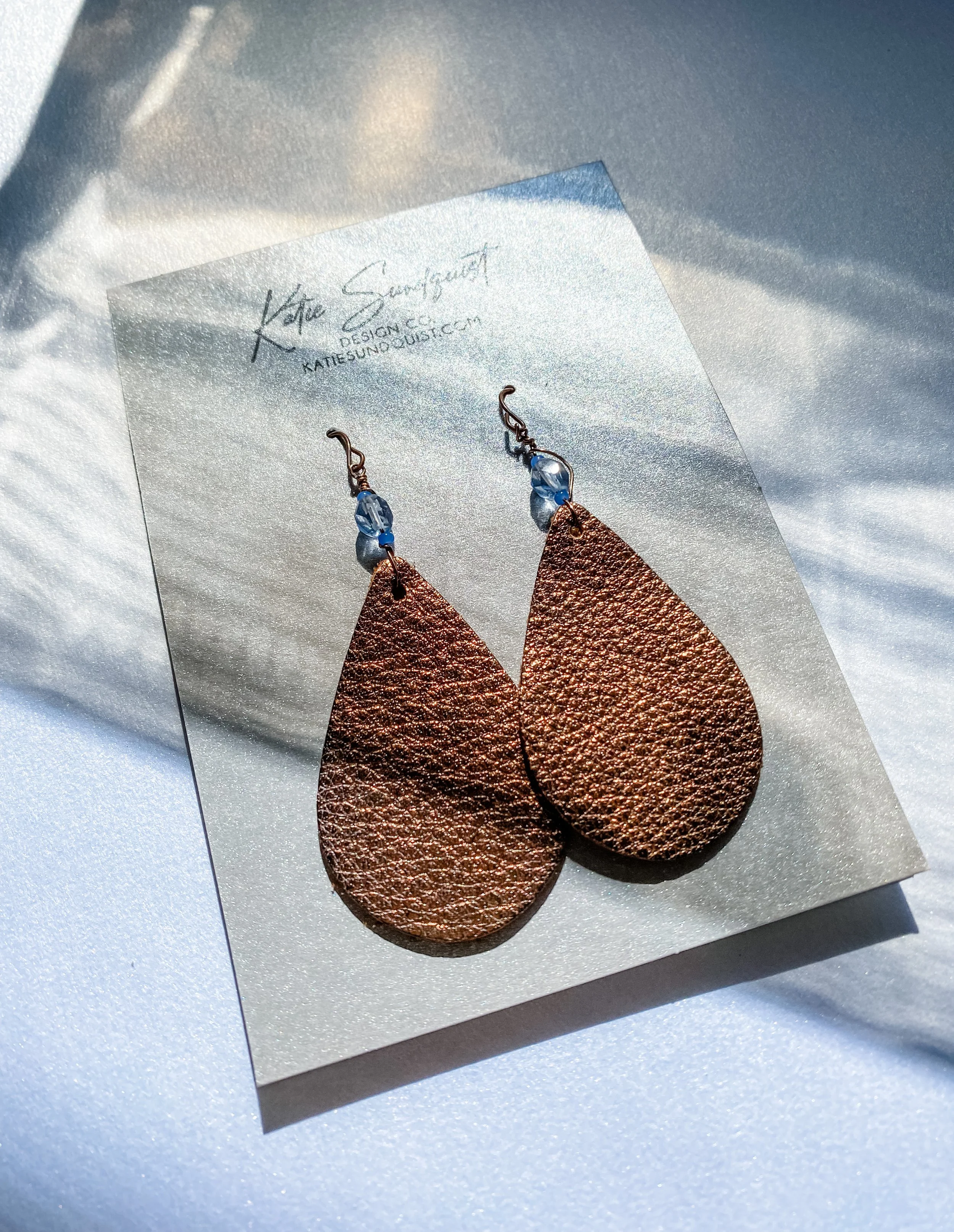 Ocean Shores Weekender Earrings —Soft gold-flecked leather hangs between matte blue and purple glass beads.